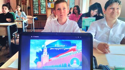В рамках внеклассного общешкольного мероприятия обучающиеся 5-9 классов с интересом посмотрели мультимедийную презентацию и видеоролики, содержащие информацию об истории возникновения праздника, подвигах наших предков во имя независимости Родины. В ходе мероприятий ребята вспомнили о том, как велика и красива наша Родина, как богата событиями её история, совершили виртуальную экскурсию по городам России, в которых в памятниках увековечена благодарность потомков главным героям этого праздника, Кузьме Минину и Дмитрию Пожарскому.